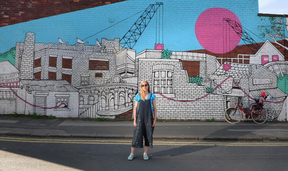 Jo painted one of her famous murals on a huge 14-metre-long wall on Alma Street. She wanted to reflect the pride of Sheffield’s people by showing the roots of the landscape including its industrial heritage and its surrounding countryside, whilst also shining a light on its current state of renewal and change.